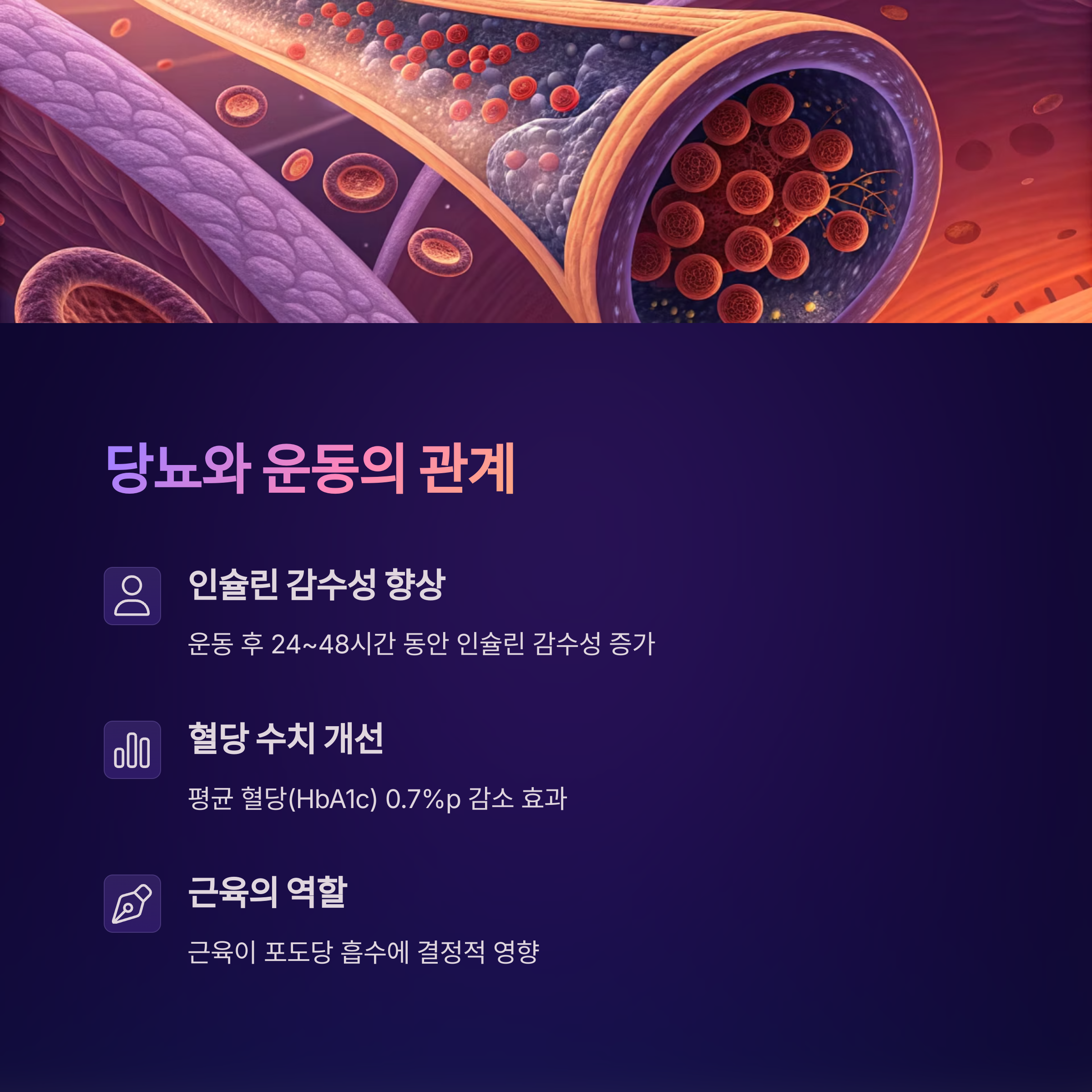 운동은 인슐린 없이도 근육이 혈당을 직접 흡수하게 만들어 혈당을 빠르게 낮춥니다.