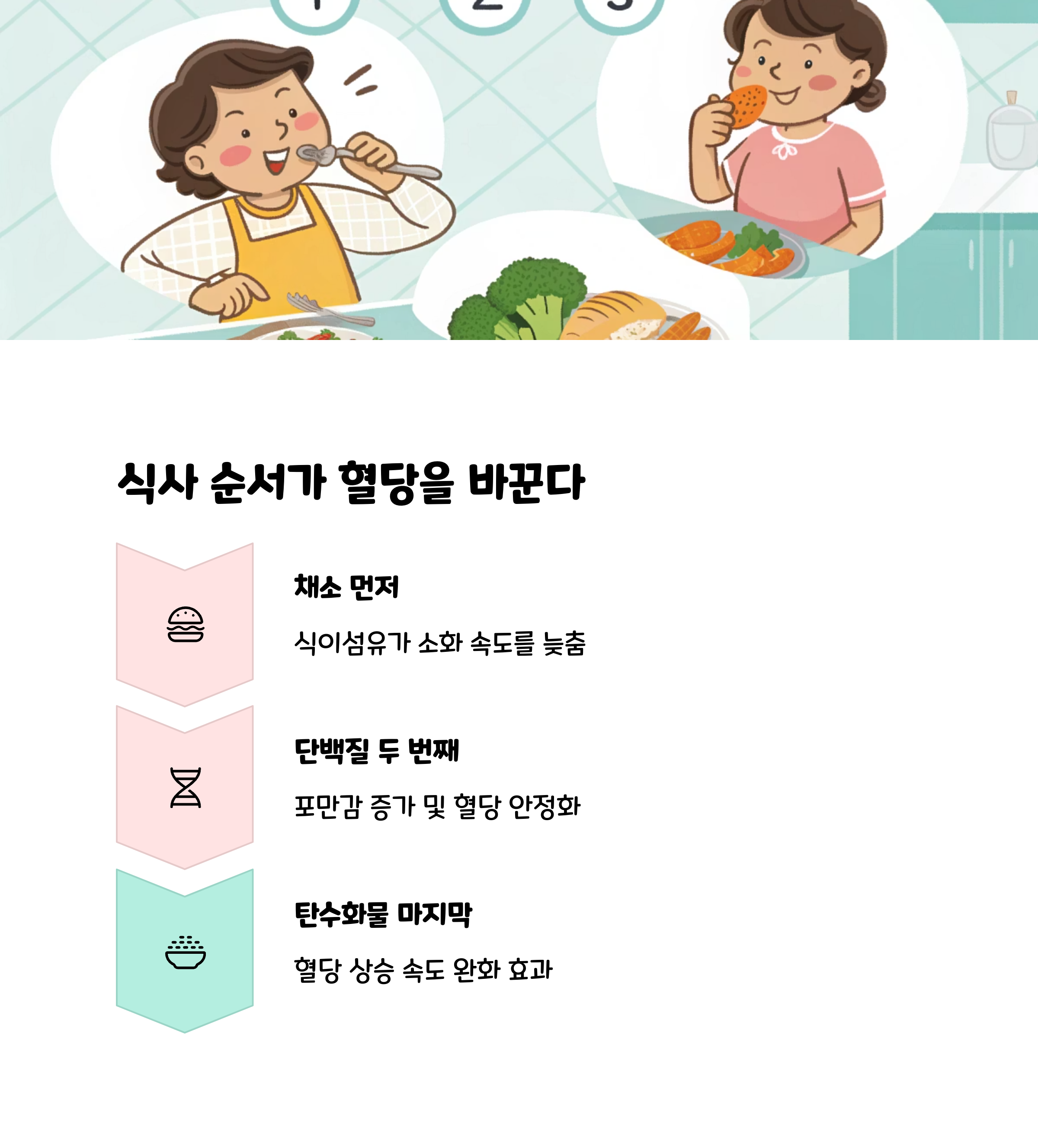 이를 위해서는 식사의 내용뿐 아니라 식사 순서, 섭취 속도, 조리 방법까지 고려해야 합니다.