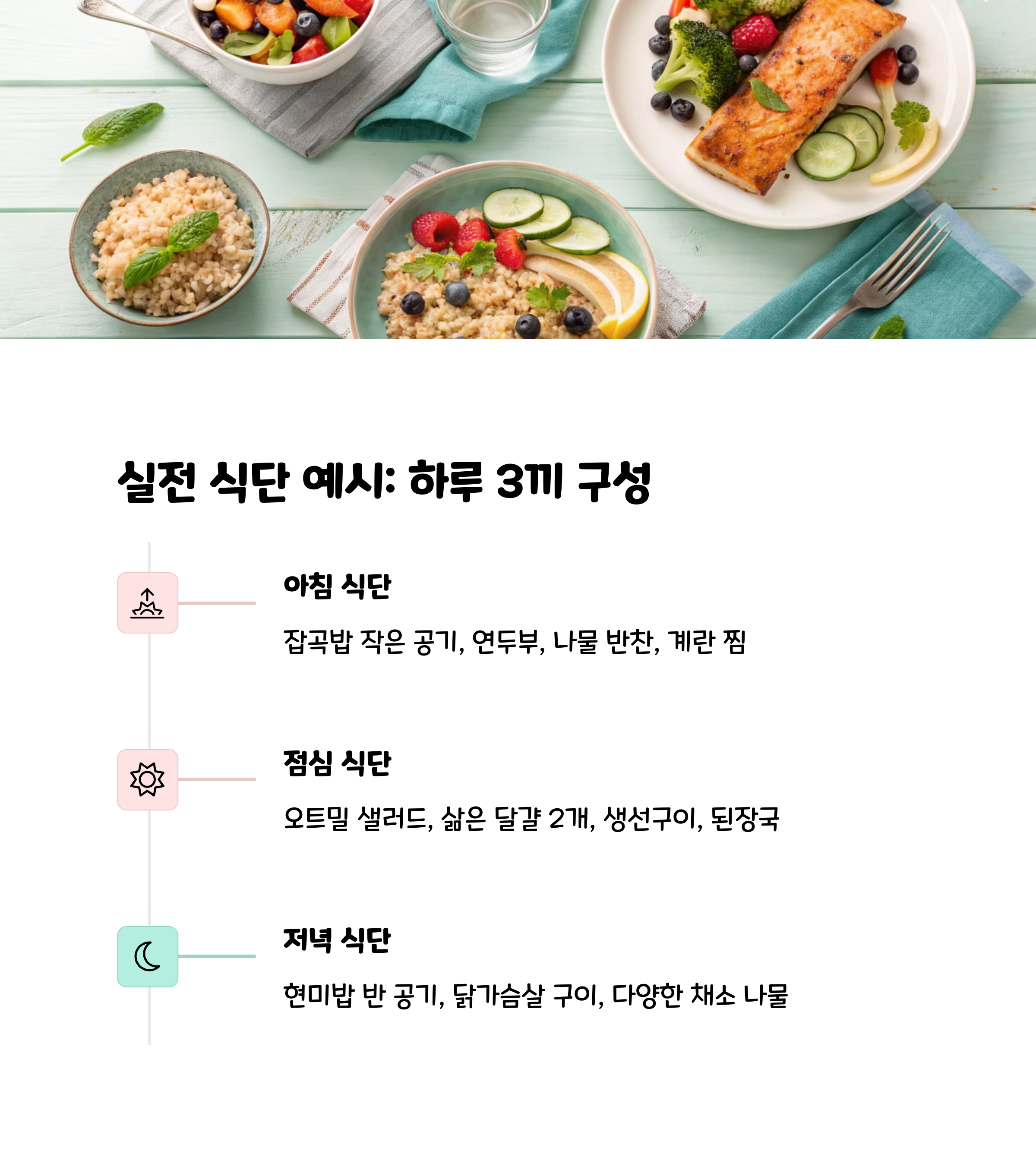 식단의 핵심은 전체적인 탄수화물 양을 줄이고, 섬유소와 단백질 중심으로 배치하는 것입니다.
