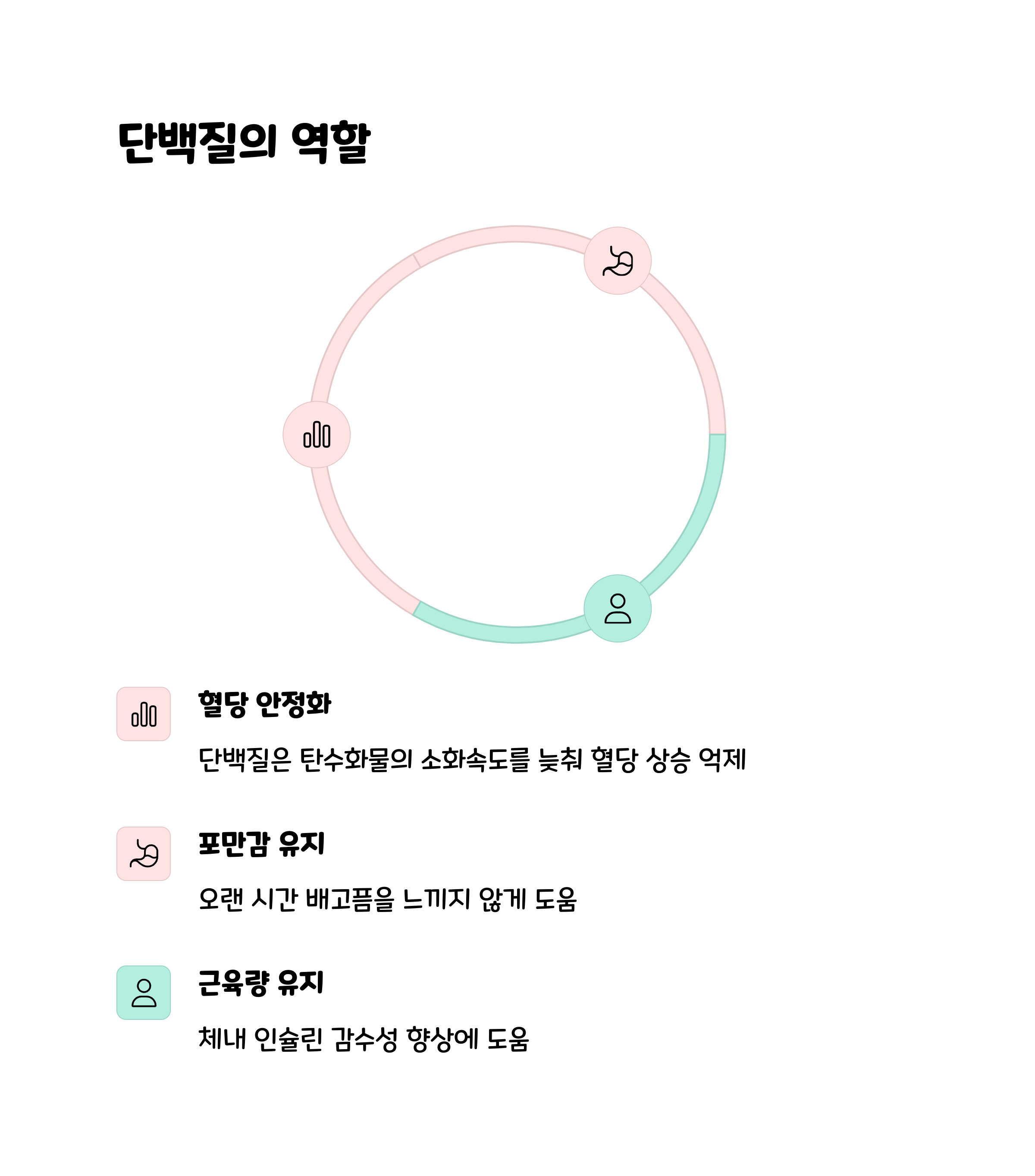 단백질은 혈당을 급격히 올리지 않으면서도 포만감을 높이고 근육 유지에 필수적입니다.