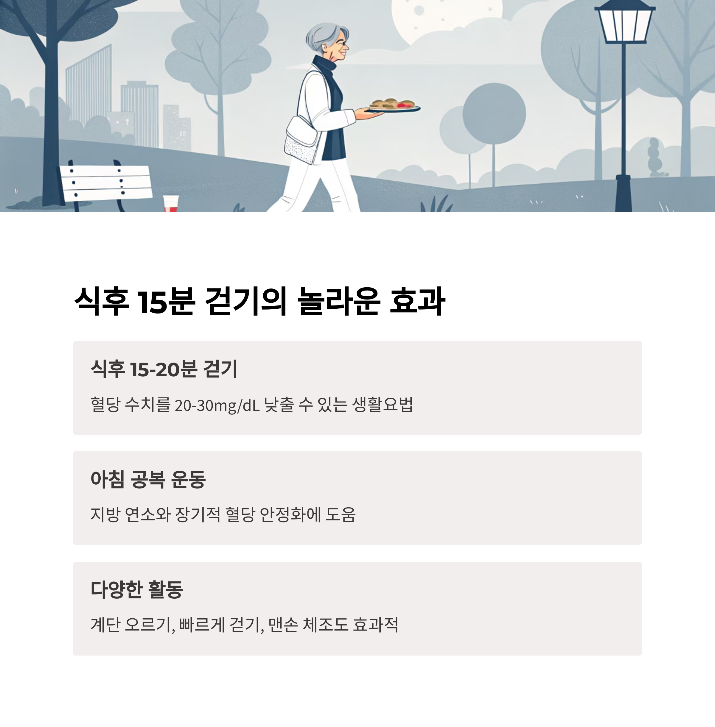 식후 1520분 사이의 가벼운 걷기는30mg/dL 낮출 수 있는 생활요법**입니다.