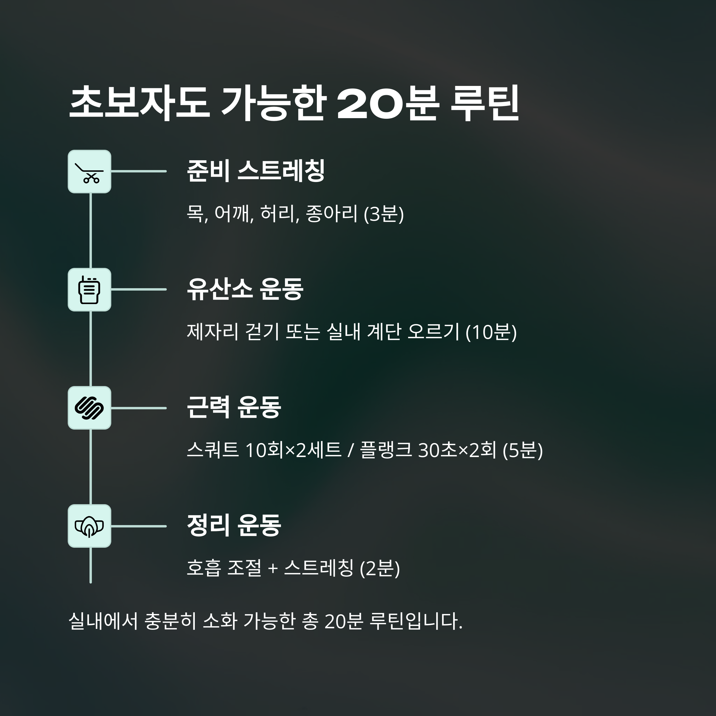 총 20분 구성으로, 실내에서 충분히 소화 가능한 루틴입니다.