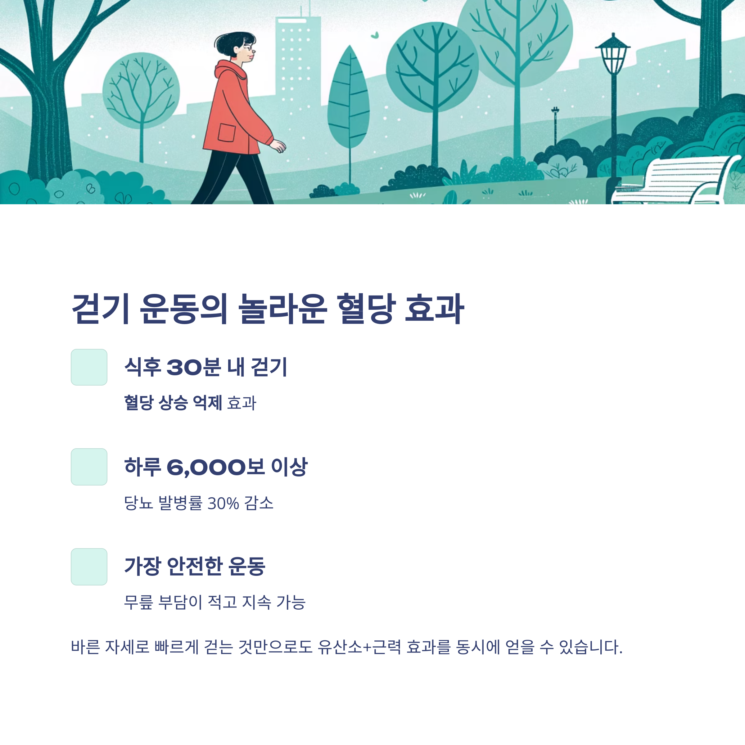 - 식후 30분 내에 걷기 시작하면 혈당 상승 억제