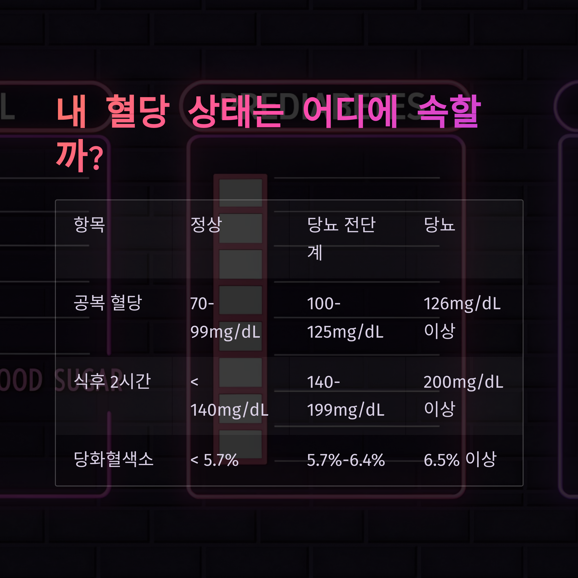 | 공복 혈당 | 70~99mg/dL | 100~125mg/dL | 126mg/dL 이상 |