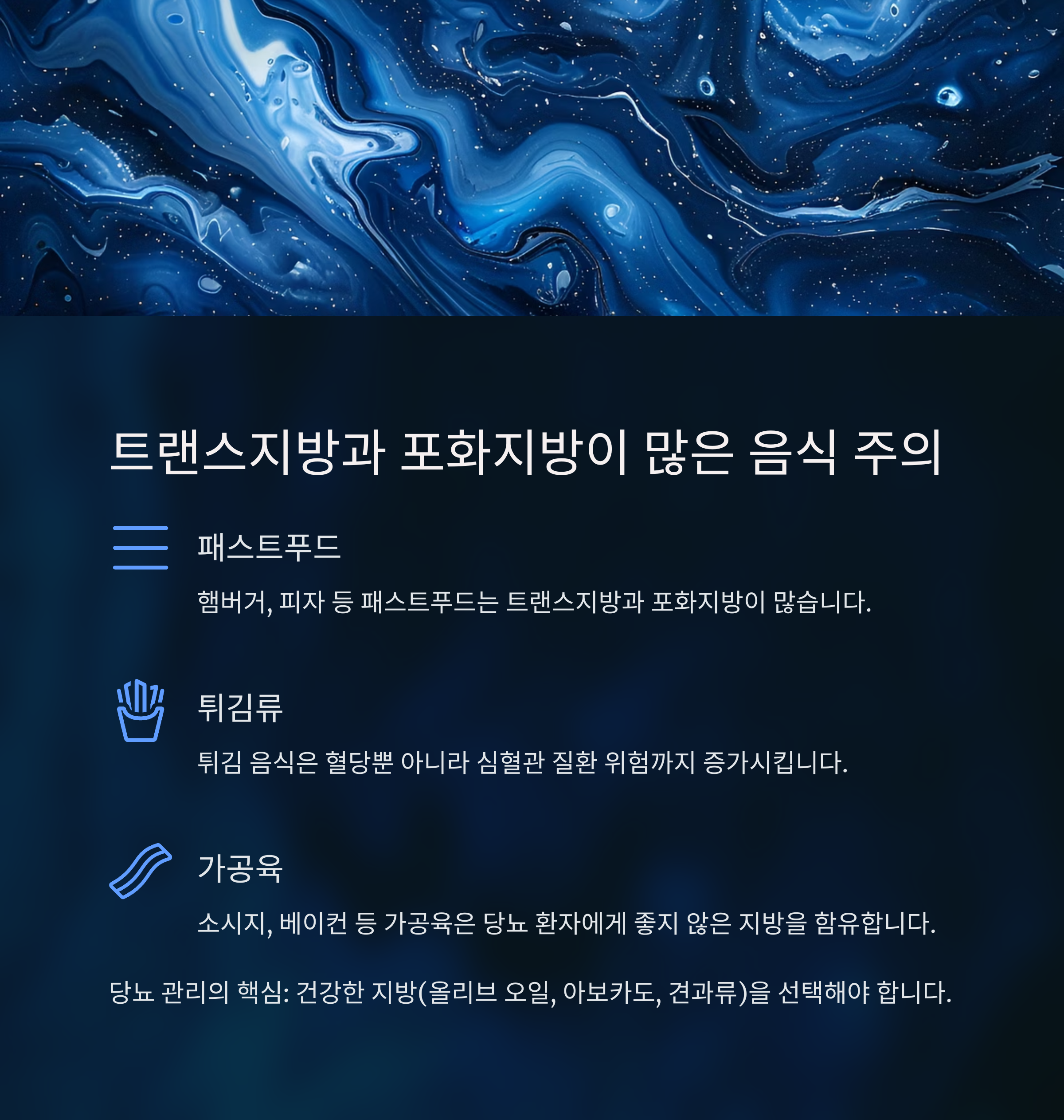 튀김류, 패스트푸드, 가공육(소시지, 베이컨)은 트랜스지방과 포화지방이 많습니다.
