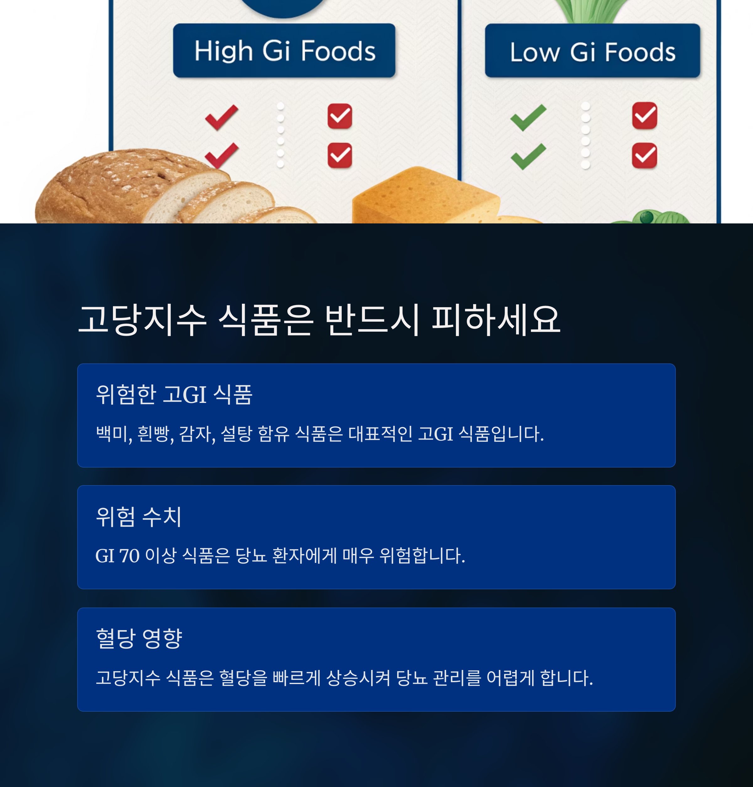 "중요: GI 70 이상 식품은 당뇨 환자에게 매우 위험합니다."