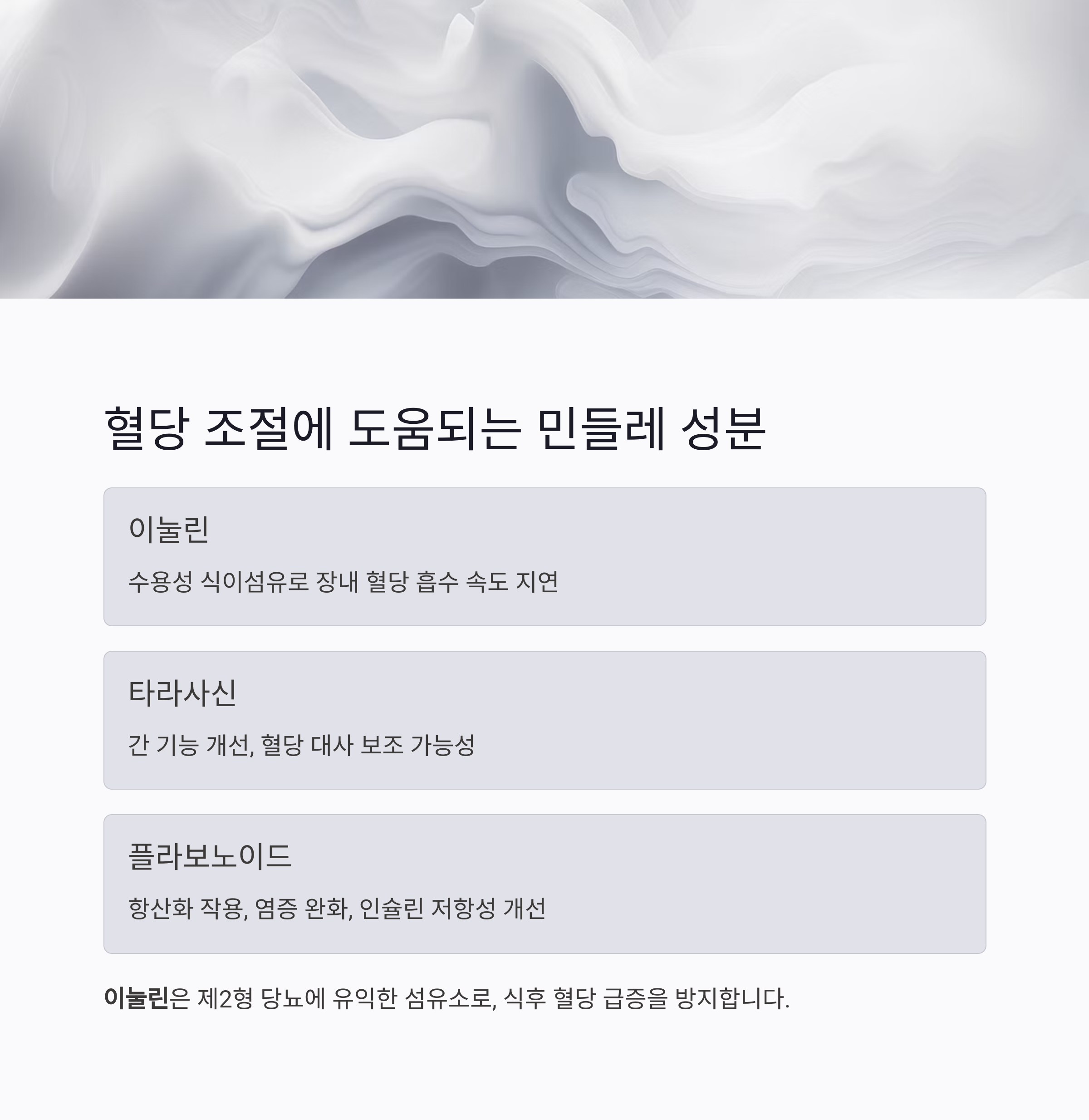 | 이눌린 | 수용성 식이섬유로 장내 혈당 흡수 속도 지연 |