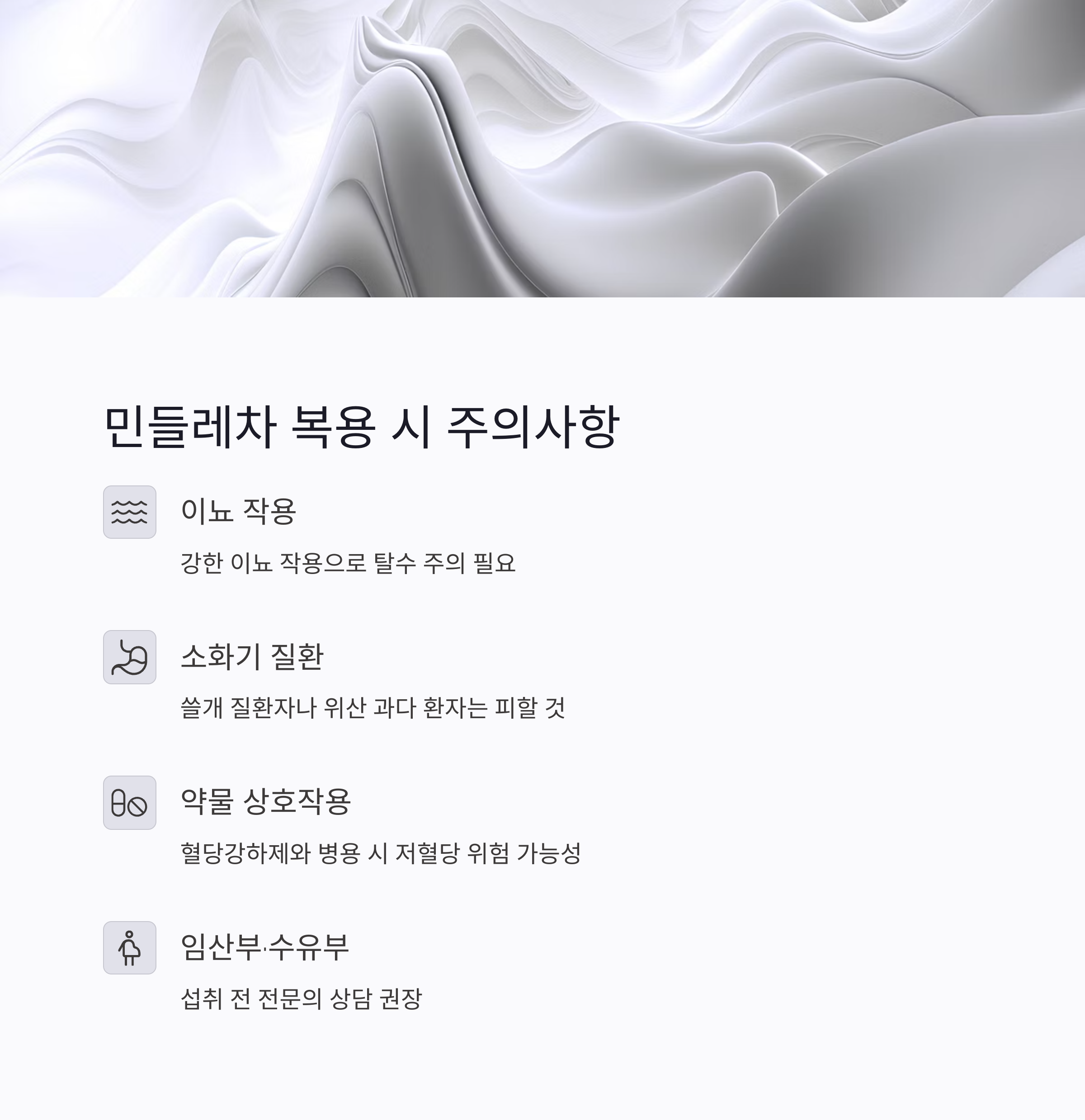 - 이뇨 작용이 강하므로 탈수 주의