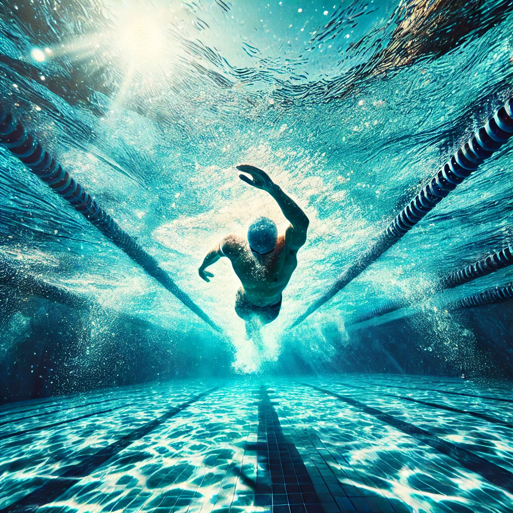 여기 수영하는 역동적인 순간을 담은 멋진 사진입니다! 맑고 푸른 물속에서 자유형을 하는 수영선수의 모습이 생동감 있게 표현되어 있어요. 물속의 반짝이는 빛과 물결이 어우러져 활기찬 분위기를 자아냅니다.