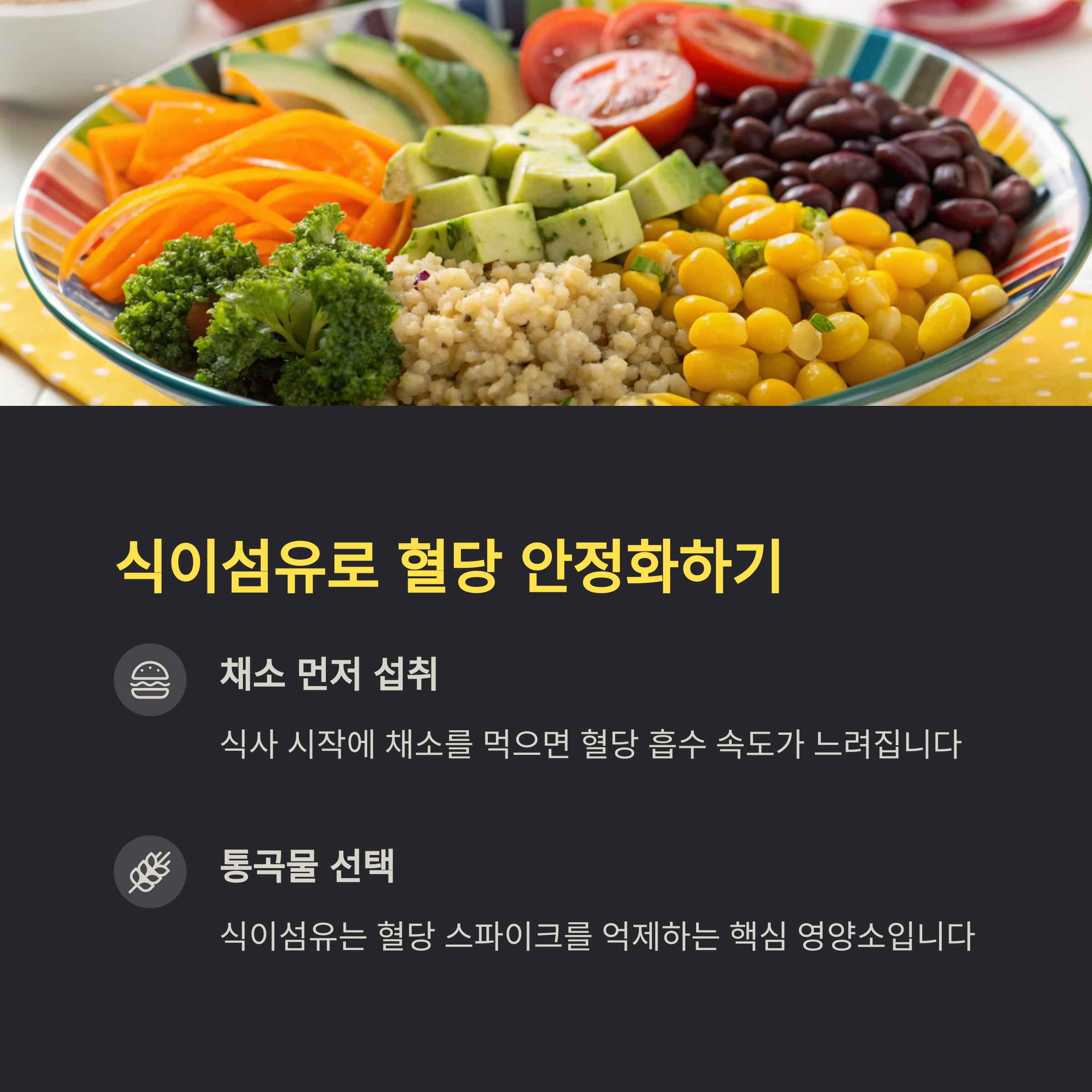 채소, 통곡물, 콩류 등 식이섬유가 풍부한 식품은 혈당 흡수를 늦춰줍니다.