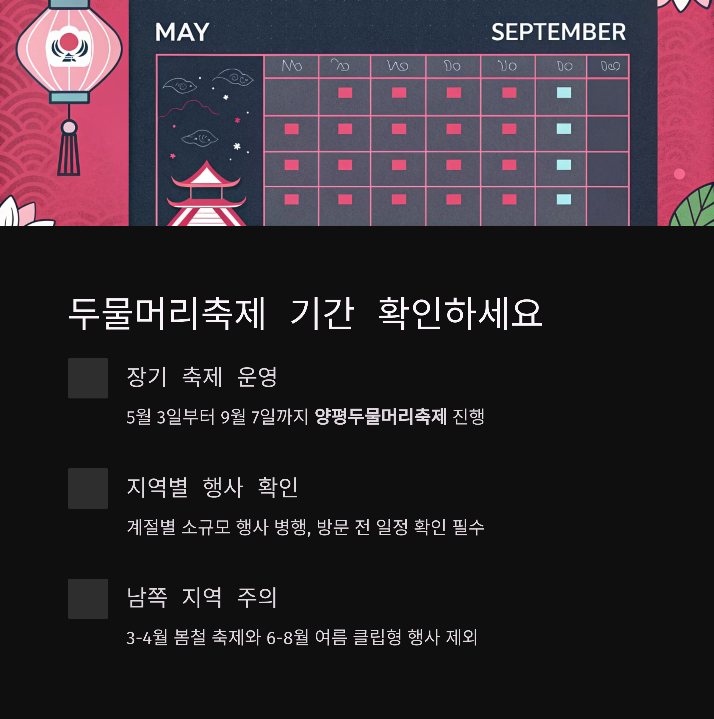 하지만 이 축제 외에도 계절별 소규모 행사들이 지역별로 병행되어 진행되므로, 방문 전 확인이 필요합니다.