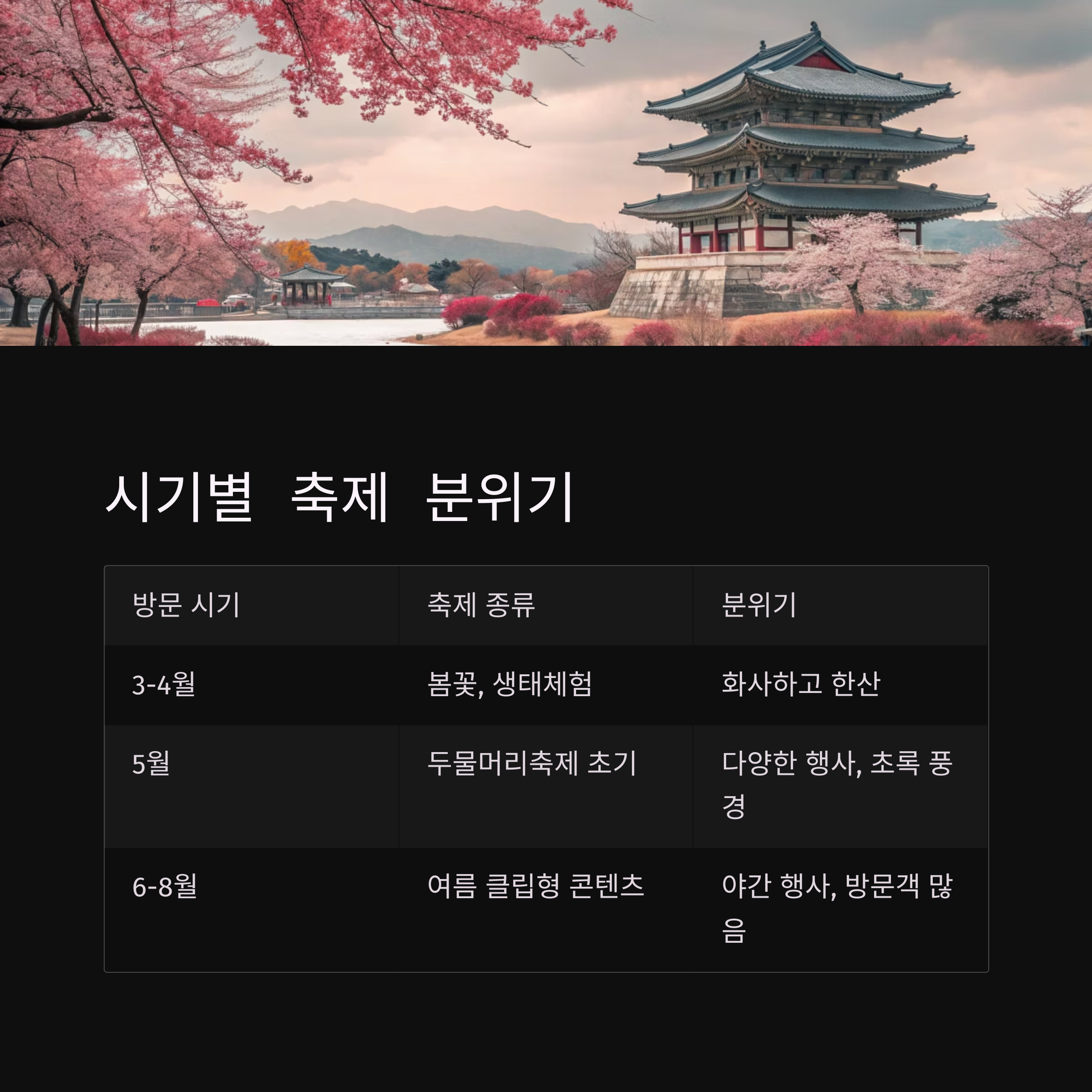 | 3~4월 | 봄꽃, 생태체험 | 화사하고 한산 |