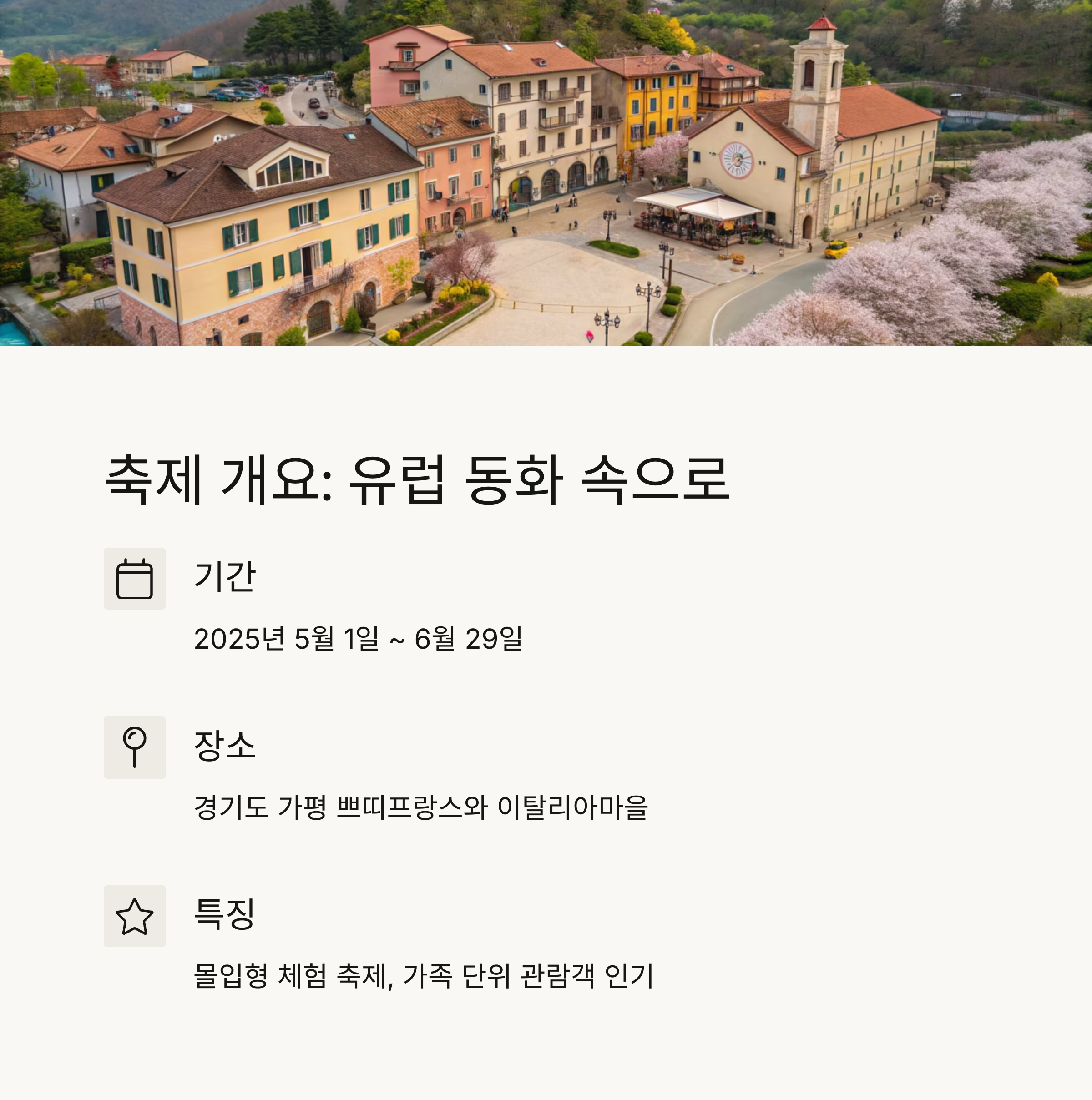 | 장소 | 쁘띠프랑스 & 이탈리아마을 (가평군) |