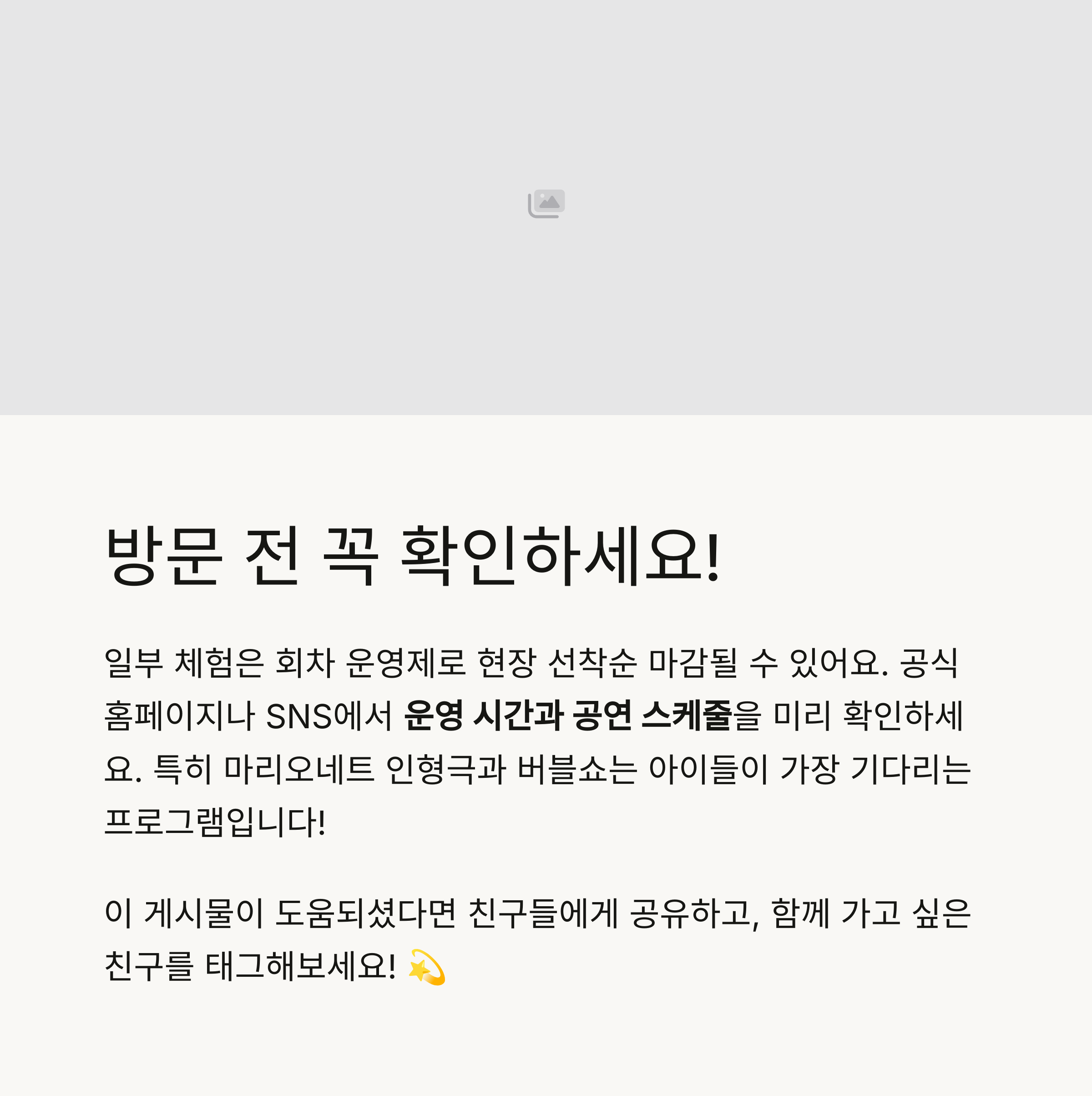 일부 체험은 회차 운영제로 현장 선착순으로 마감될 수 있으니, 공식 홈페이지 또는 SNS를 통해 운영 시간과 공연 스케줄을 사전 확인하는 것이 좋습니다.