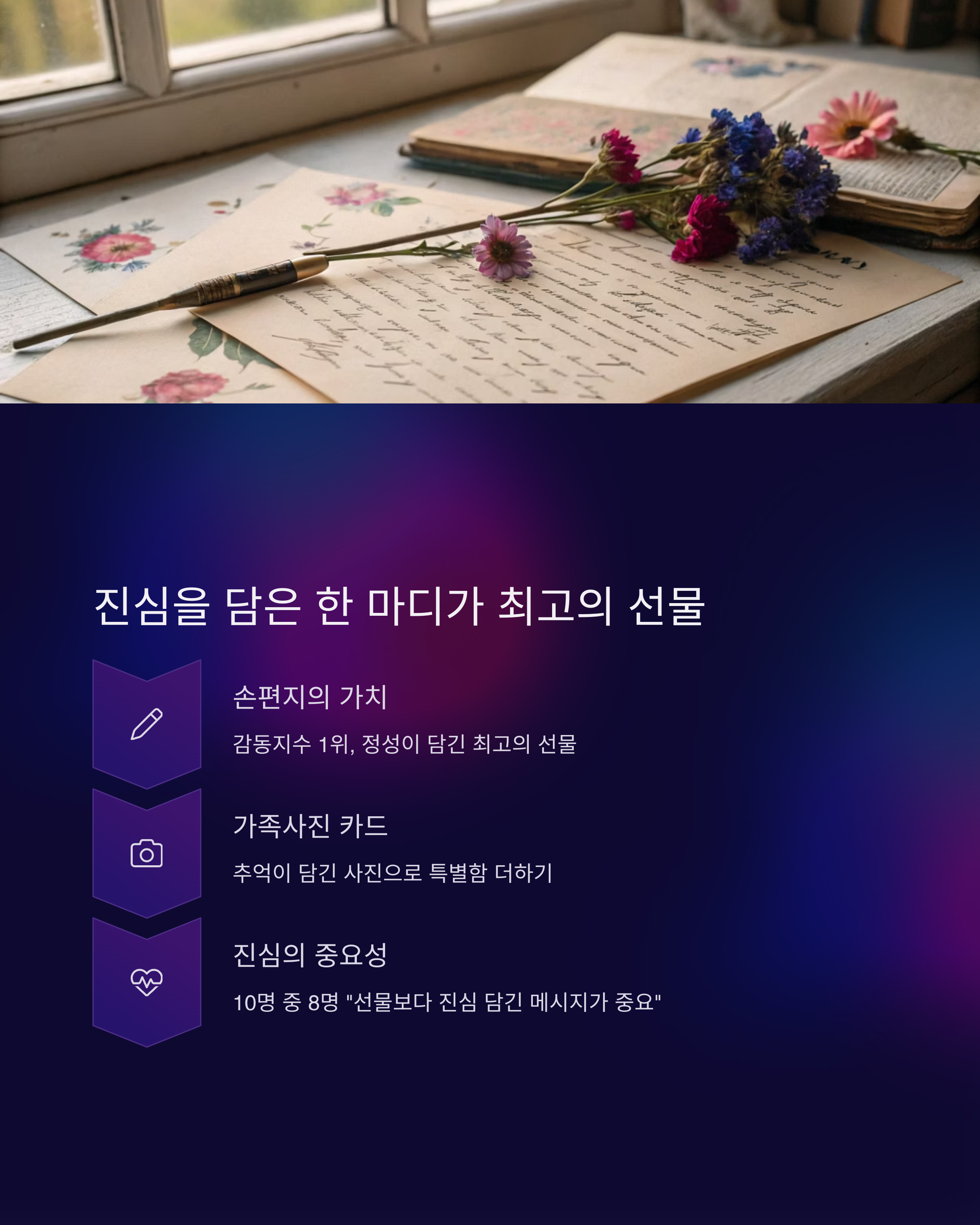 선물과 함께 짧은 손편지나 카드 한 장을 꼭添하세요.