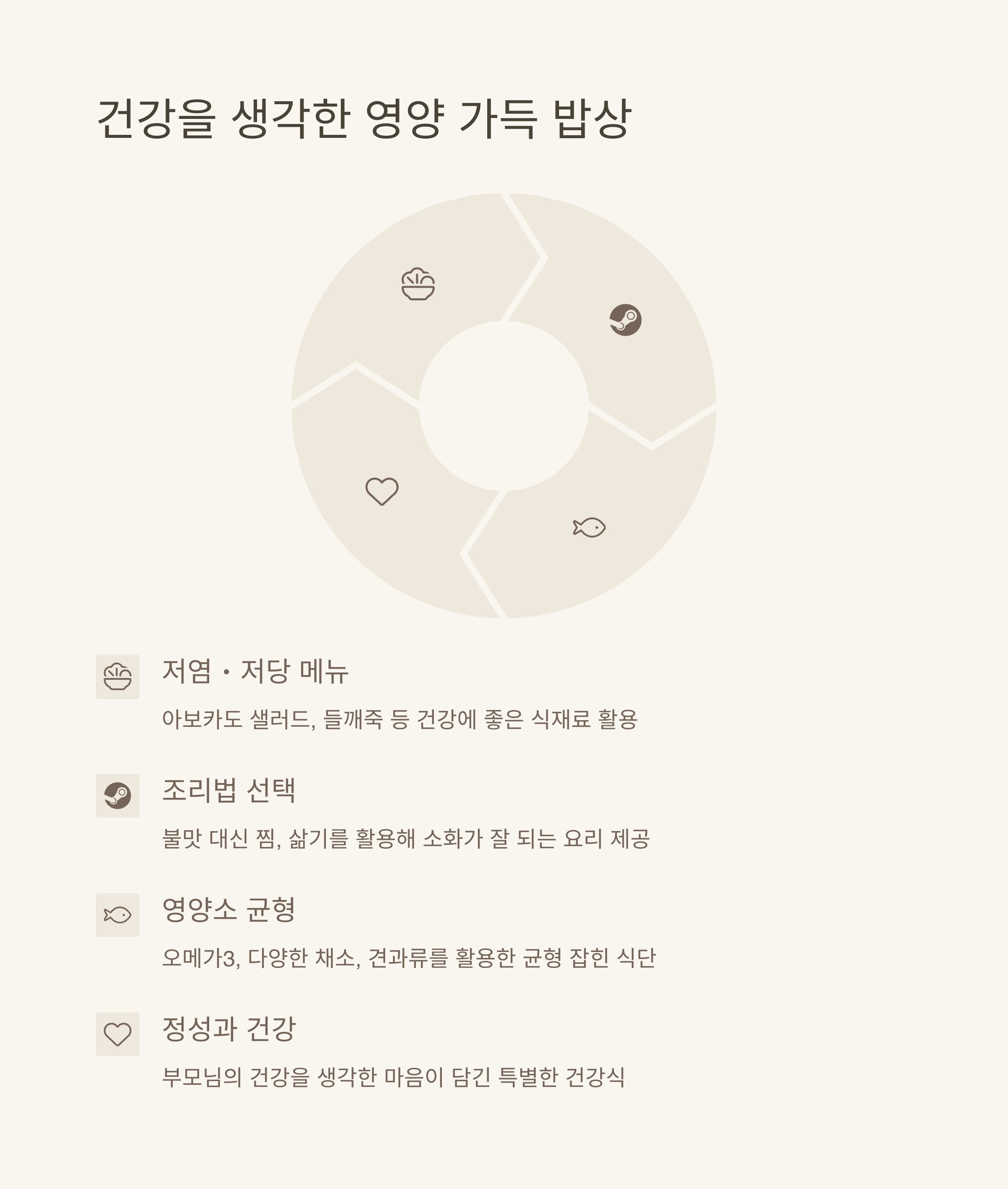 연세가 있으신 부모님을 위한 식사는 자극보다 영양과 소화력을 고려해야 합니다.