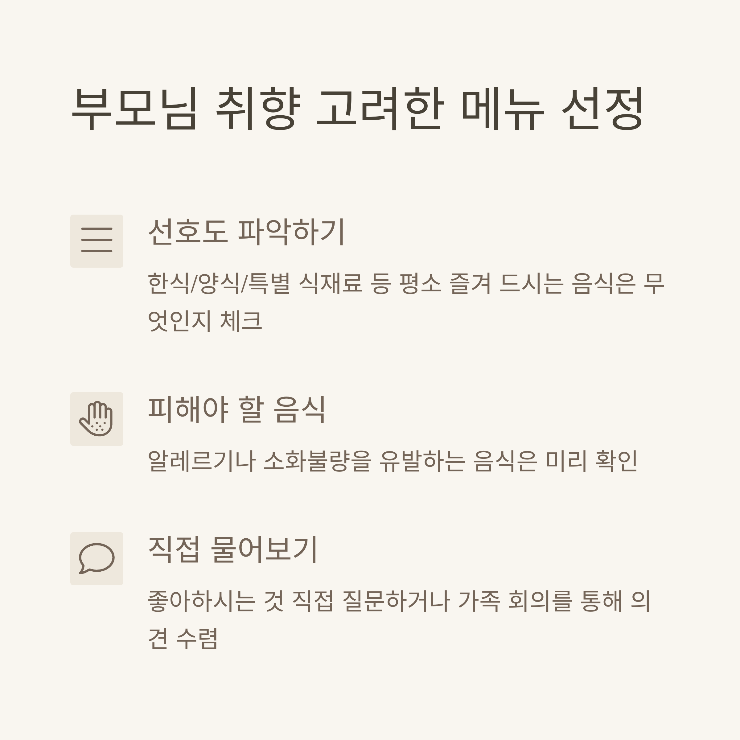 고기를 좋아하시는지, 한식을 선호하시는지, 소화에 민감하신지도 중요합니다.
