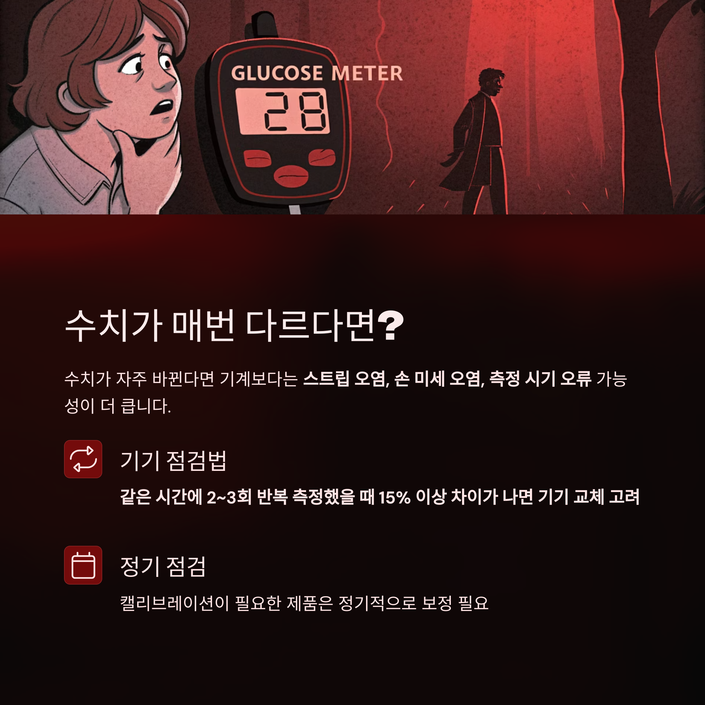 수치가 자주 바뀐다면 기계보다는 스트립 오염, 손 미세 오염, 측정 시기 오류 가능성이 더 큽니다.