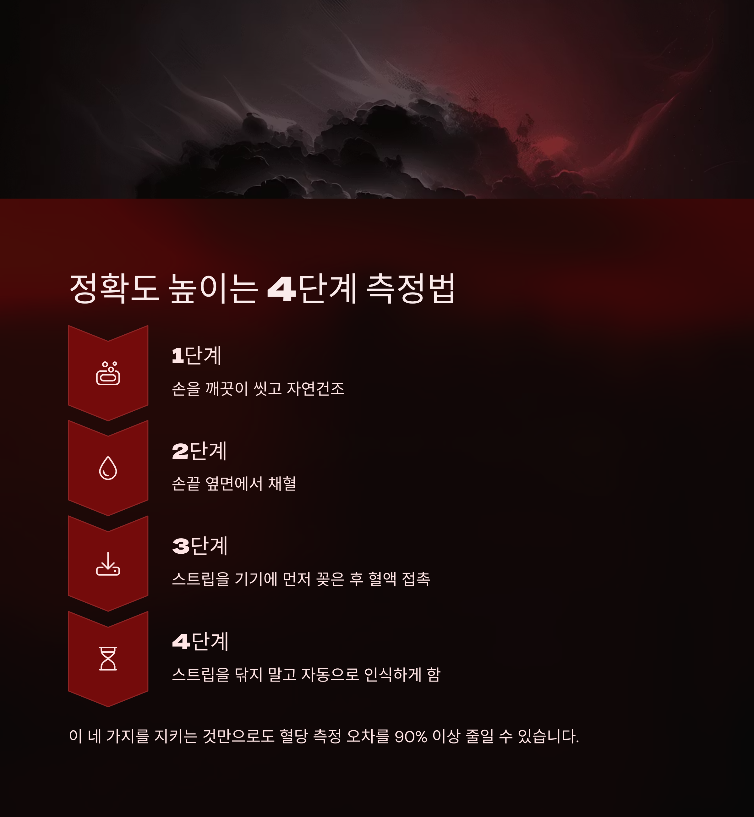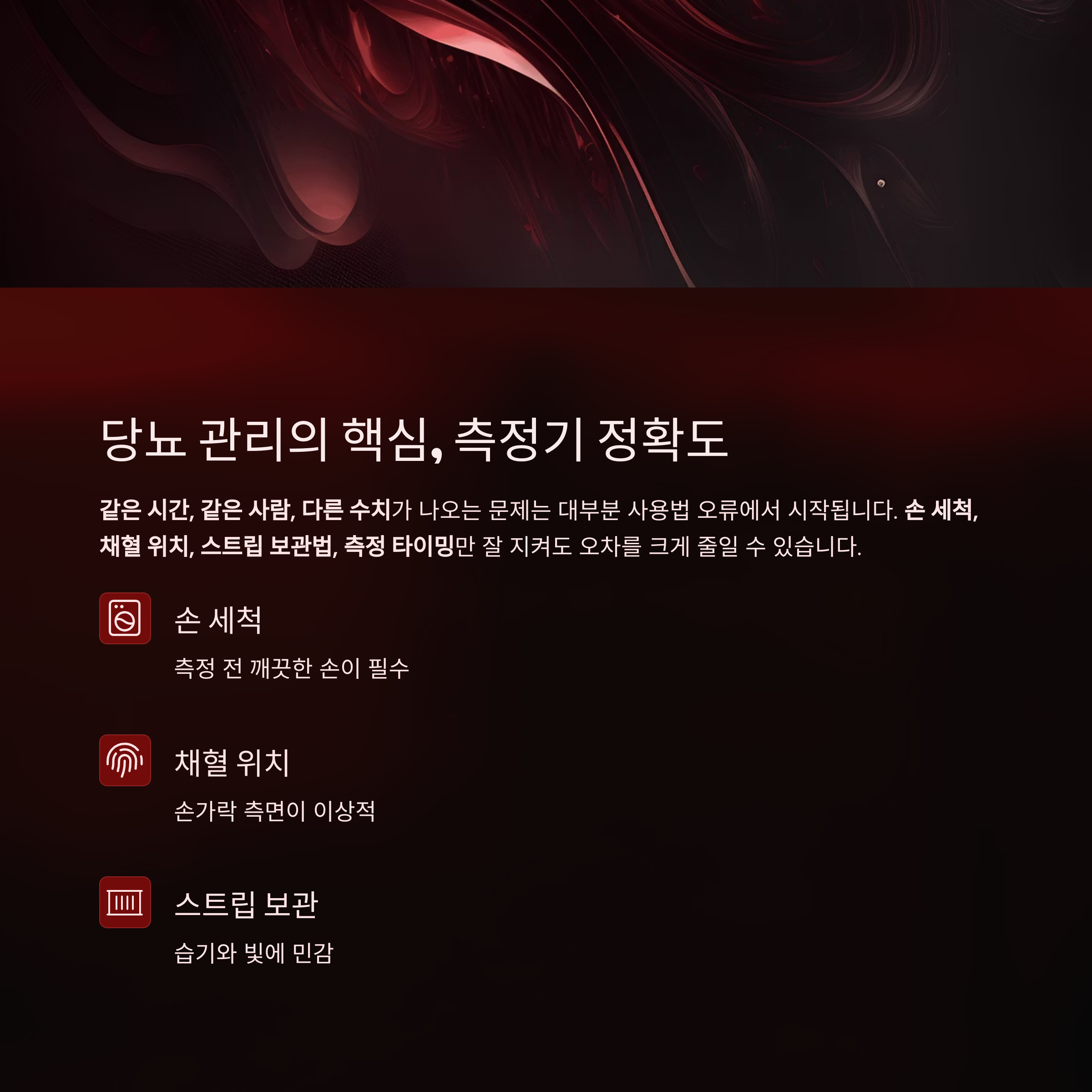 손 세척, 채혈 위치, 스트립 보관법, 측정 타이밍만 잘 지켜도 오차를 크게 줄일 수 있습니다.