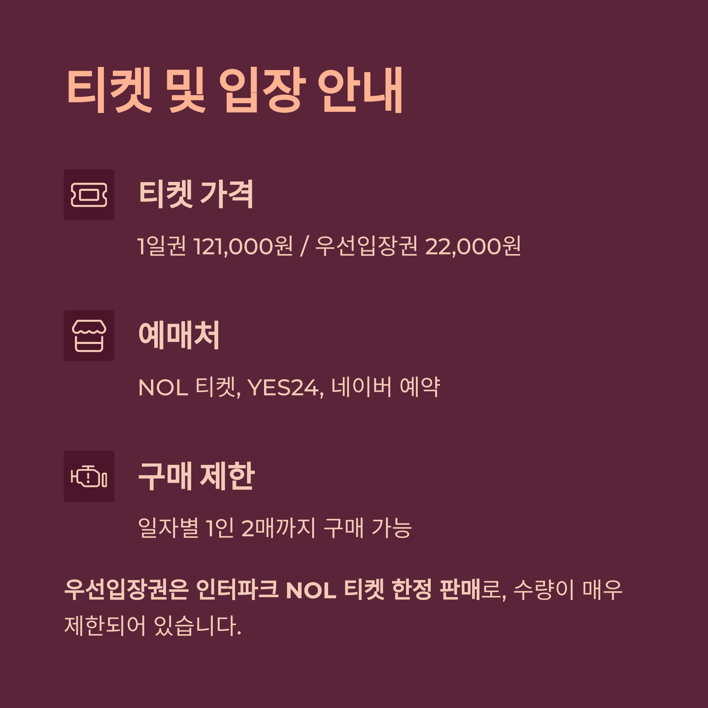 | 판매 제한 | 일자별 1인 2매까지 구매 가능 |