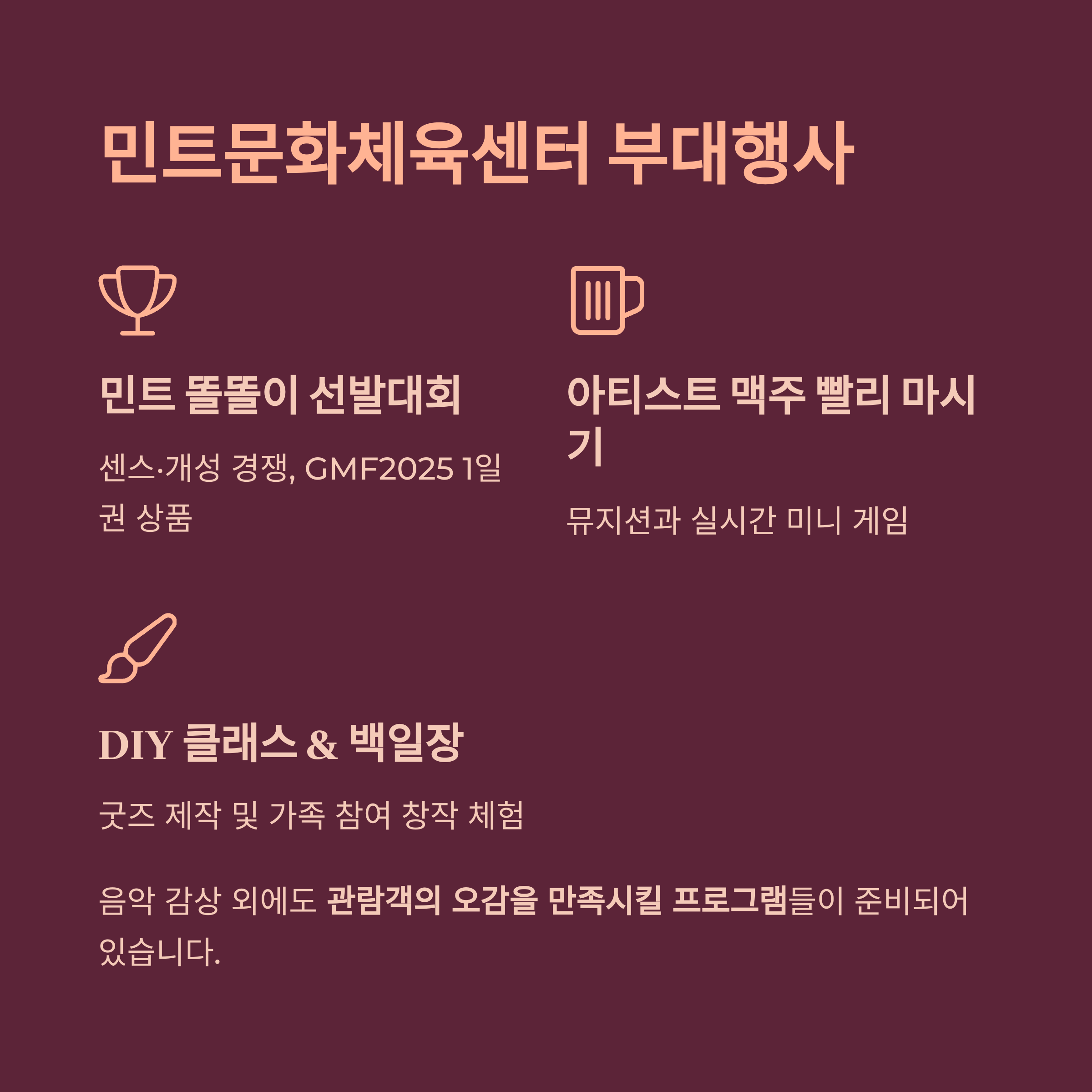 | DIY 클래스 | 굿즈 제작 및 워크숍 운영 |