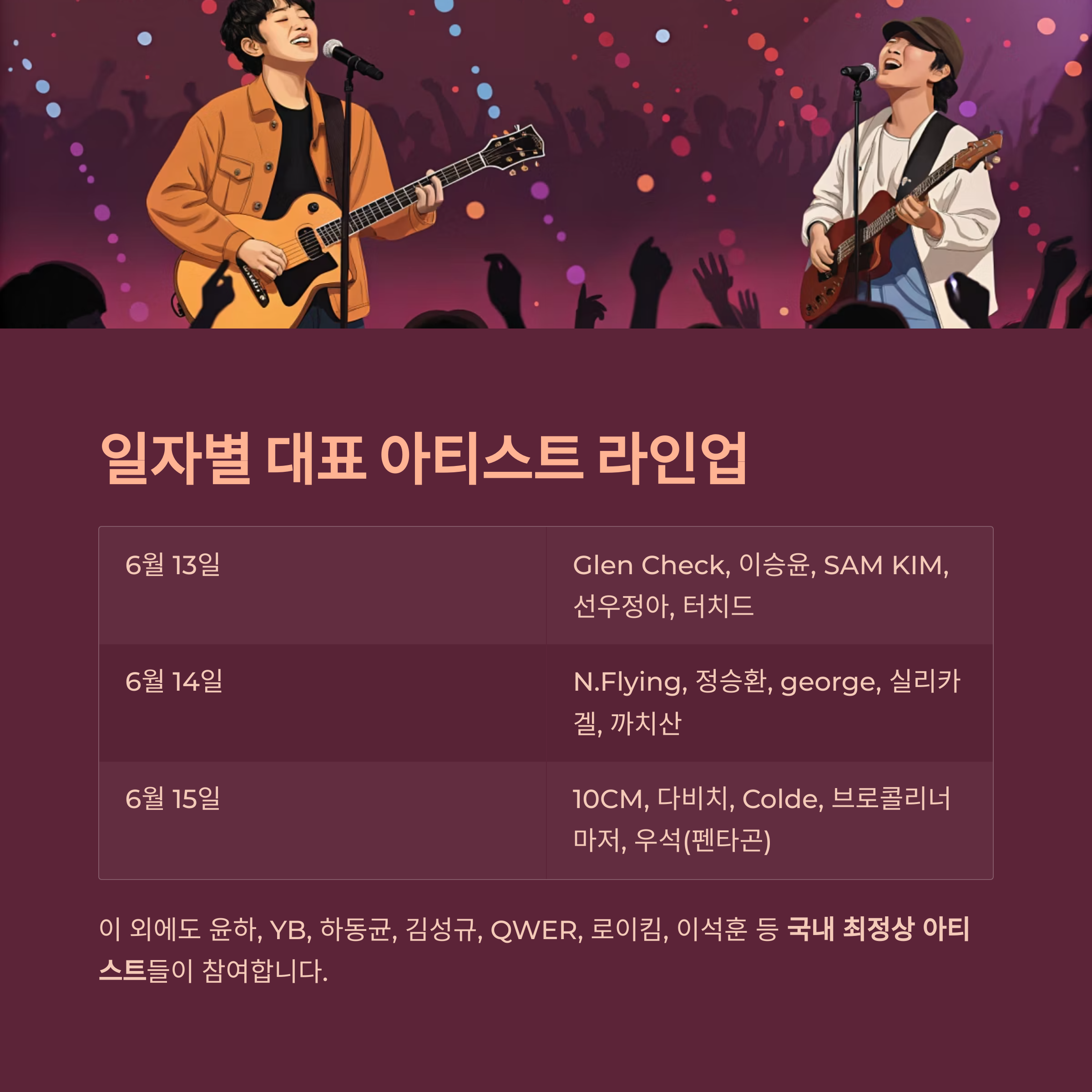 이 외에도 윤하, YB, 하동균, 김성규, QWER, 로이킴, 이석훈 등