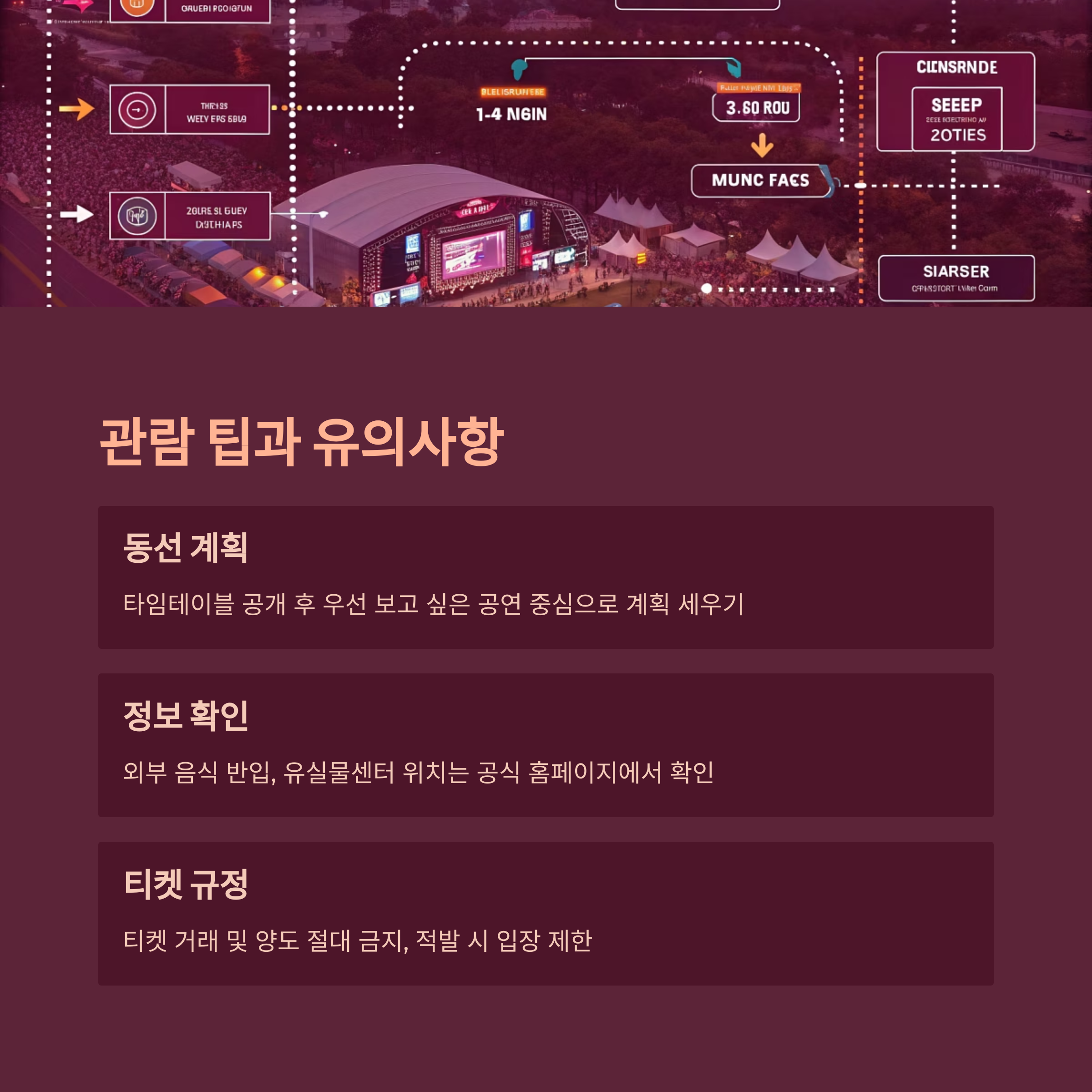 우선 보고 싶은 공연을 중심으로 동선 계획을 세우는 것이 핵심입니다. - 외부 음식 반입 가능 여부, 유실물센터 위치 등은