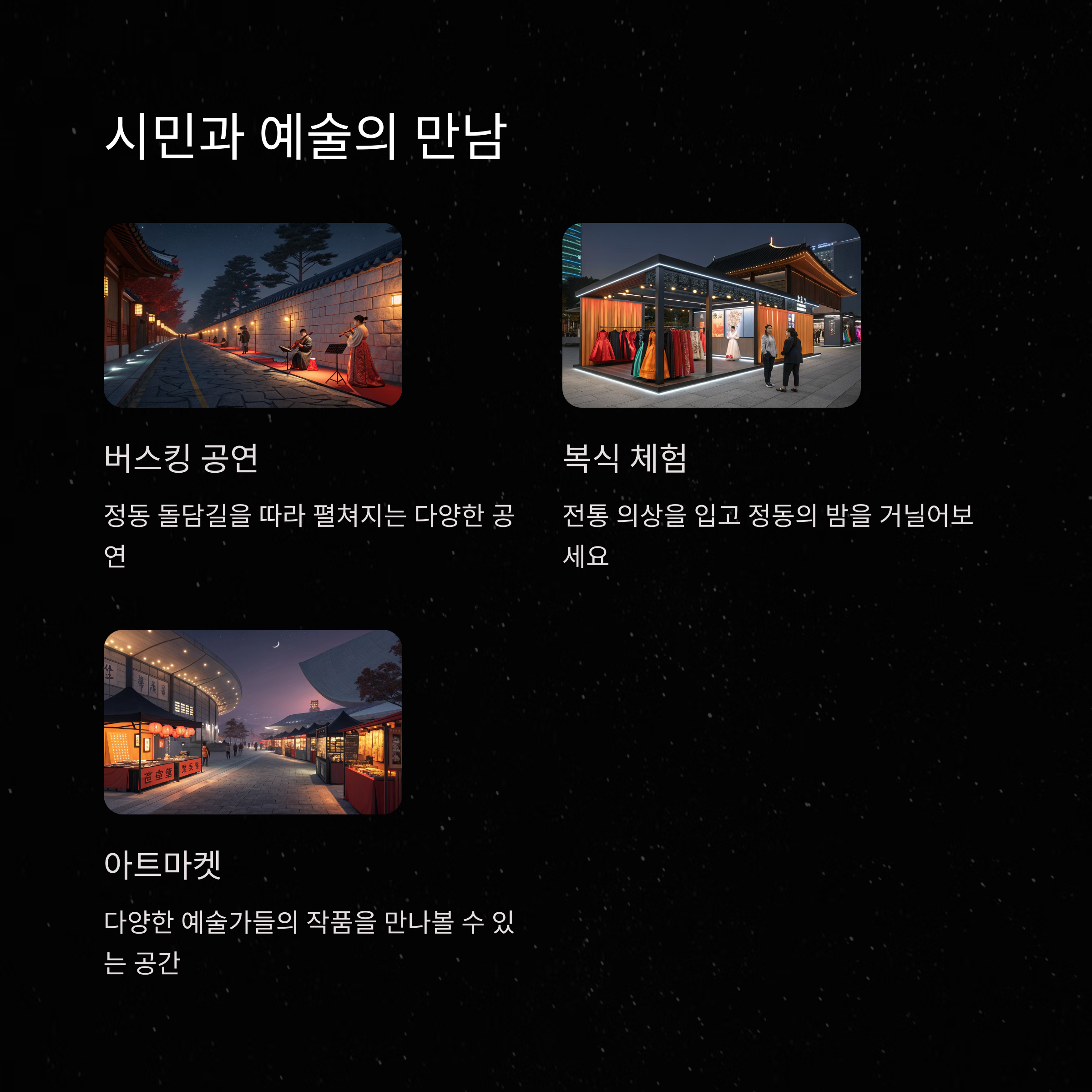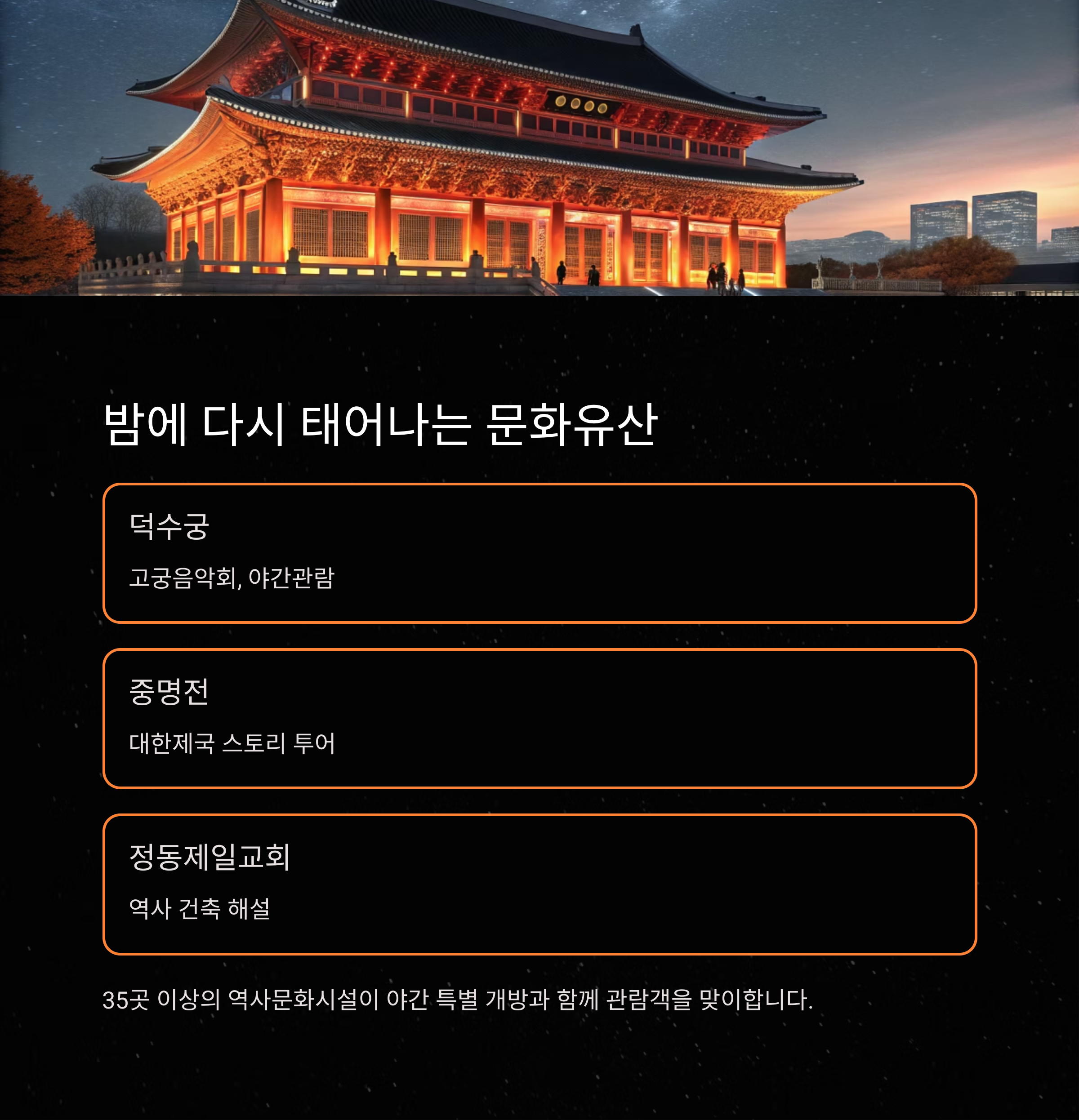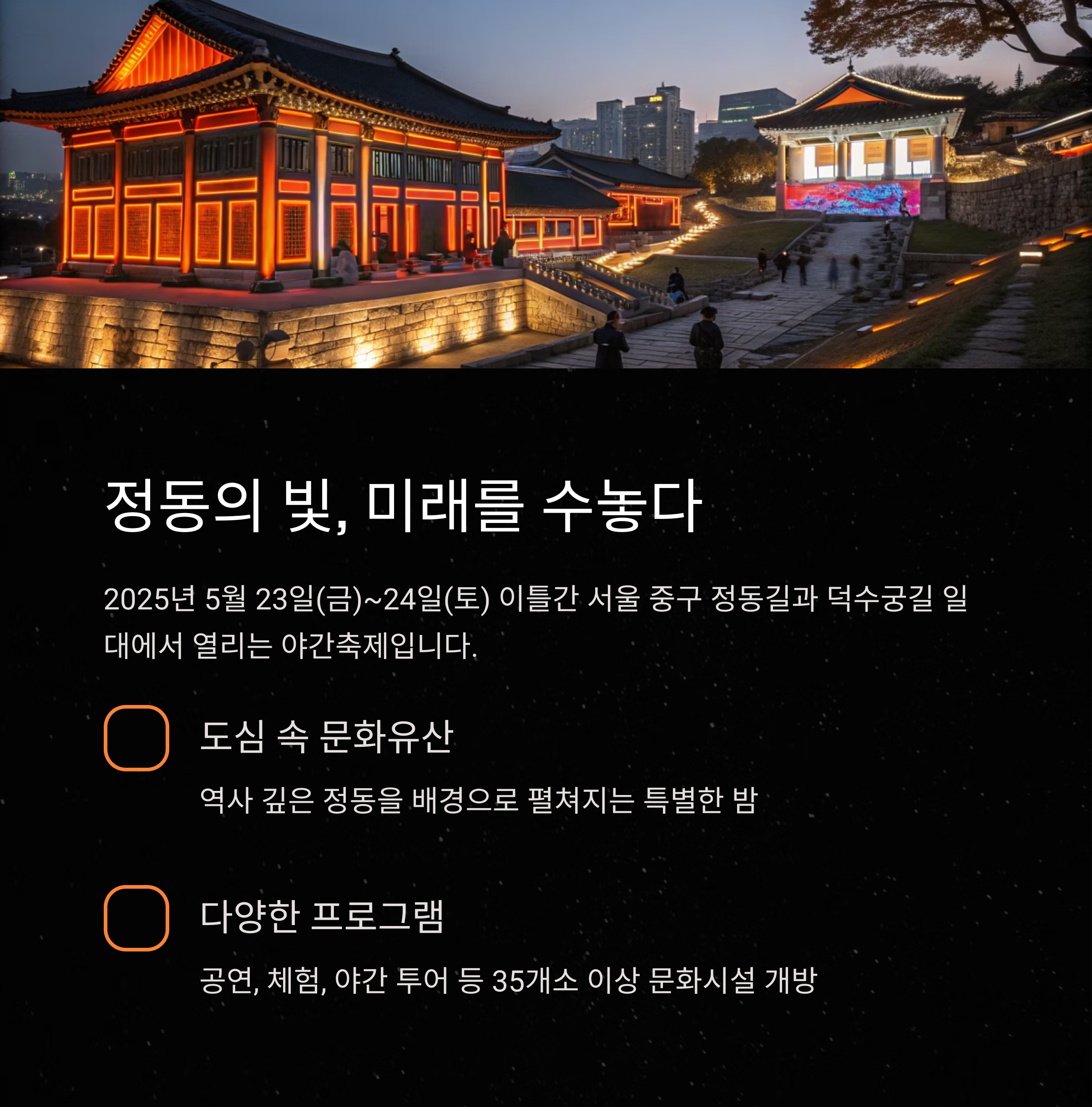 정동의 상징적인 공간들이 밤의 빛과 해설로 새롭게 조명됩니다.